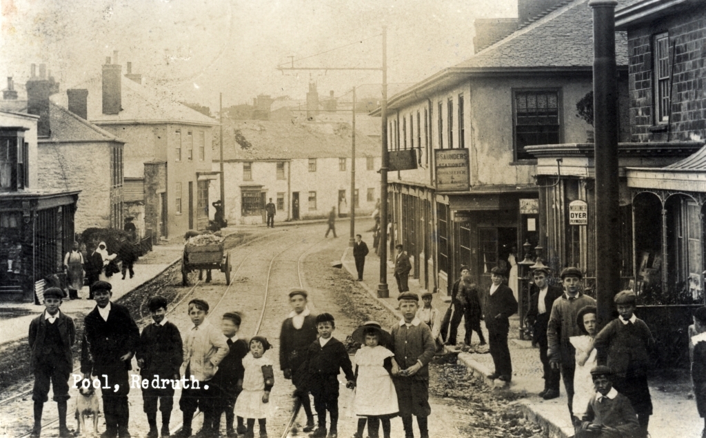 The rails and overhead wires of the Camborne-Redruth tram service which commenced in 1902 and ended in 1934 are visible.