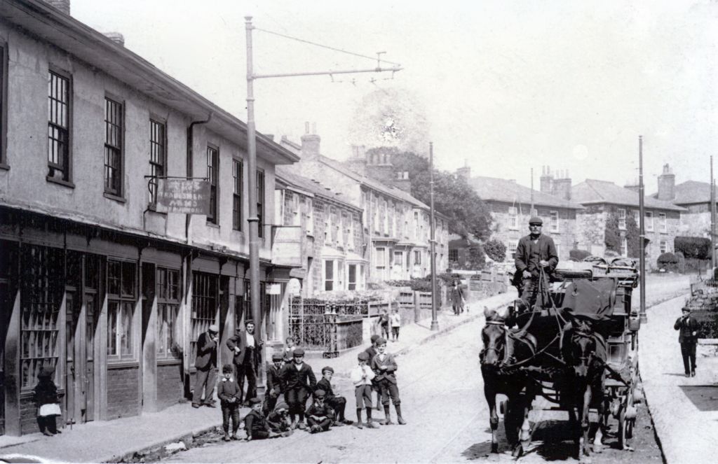 Fore Street after the commencement of the Camborne-Redruth Tram Service. The Tradesmen's Arms is on the left.