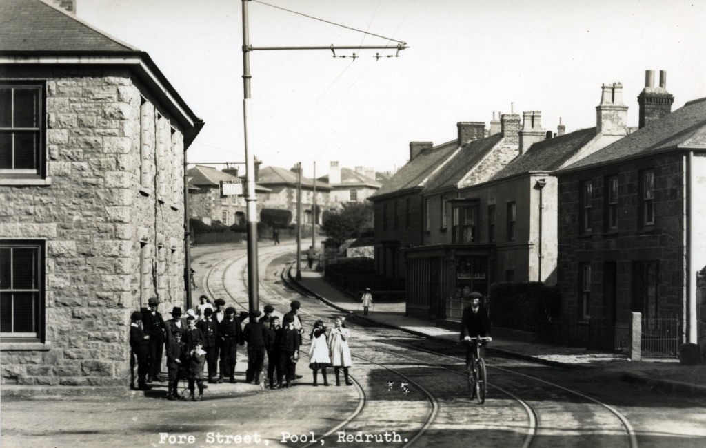 The rails and overhead wires of the Camborne-Redruth tram service which commenced in 1902 and ended in 1934 are visible