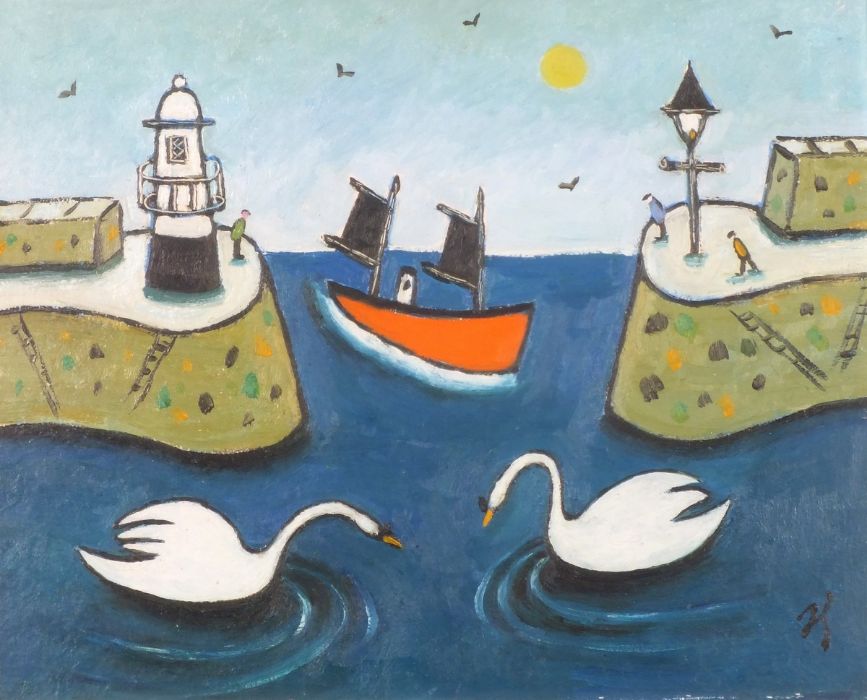 Joan Gillchrest (1918-2008): Three Swans in St Ives Harbour