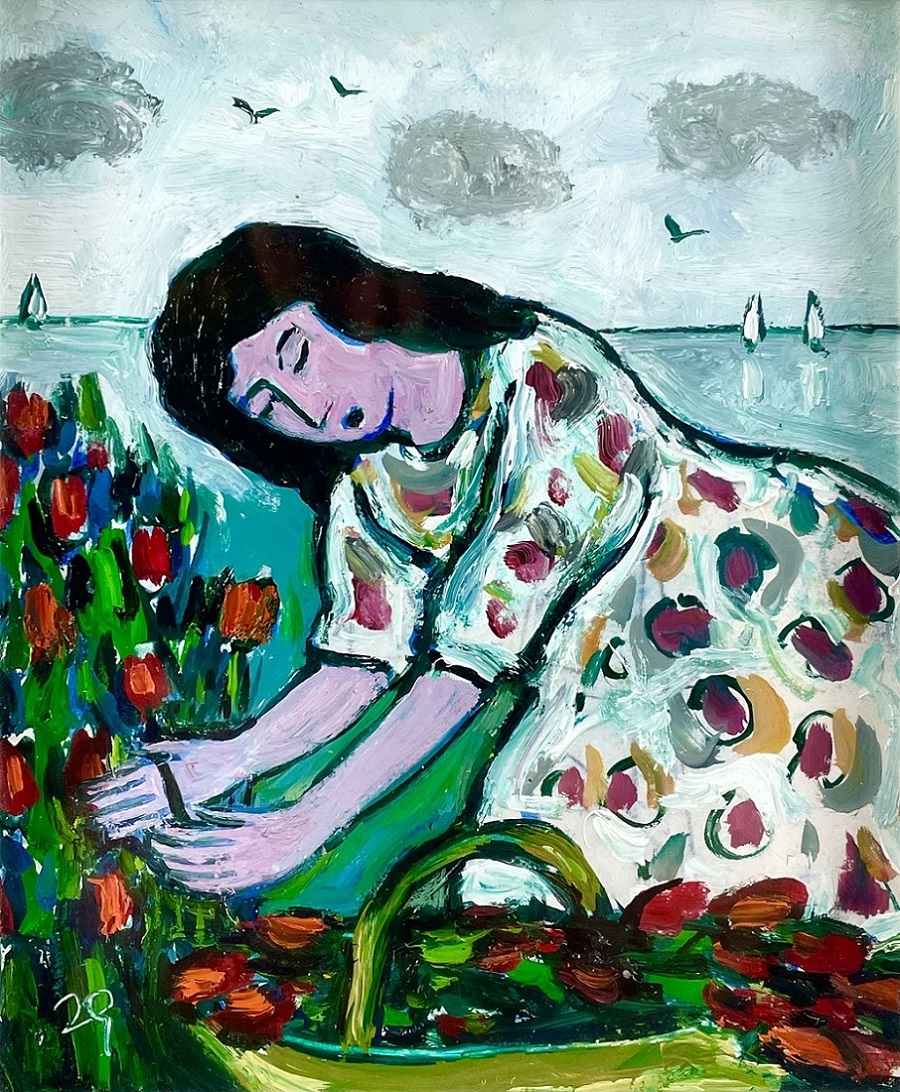 Joan Gillchrest (1918-2008): Lady Gathering Tulips
