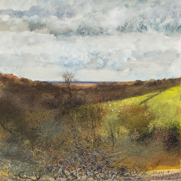 Kurt Jackson (1961-): Sheep and goldfinches (2016). Private collection
