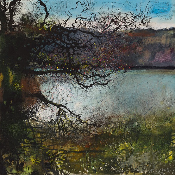 Kurt Jackson (1961-): Jays arguing in the oaks above the creek (2017). Private collection