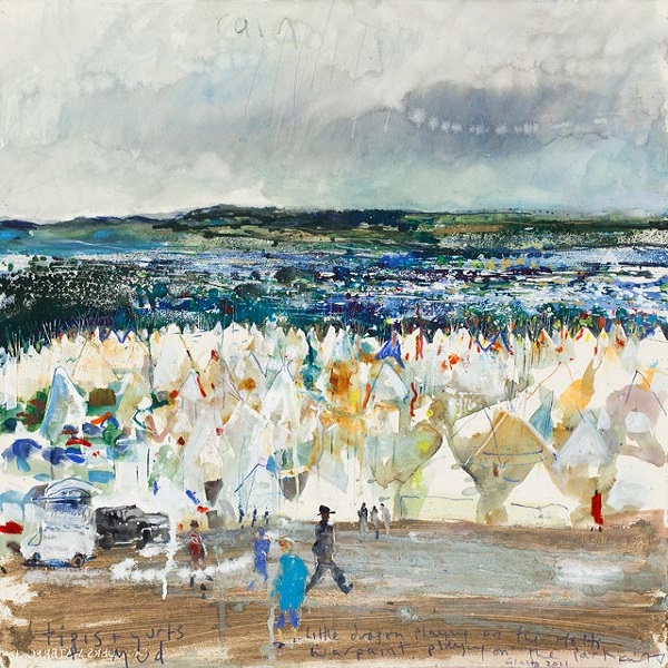 Kurt Jackson (1961-): Tipis and yurts and mud. Glastonbury Festival (2011)