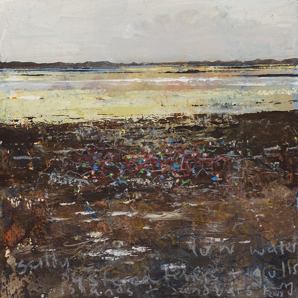 Kurt Jackson (1961-): Low water, oyster catchers and gulls, islands and sandbars (2018)