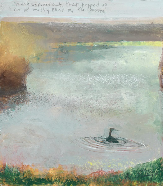 Kurt Jackson (1961-): Young cormorant that popped up on a misty pond on the moors (2017). Private collection