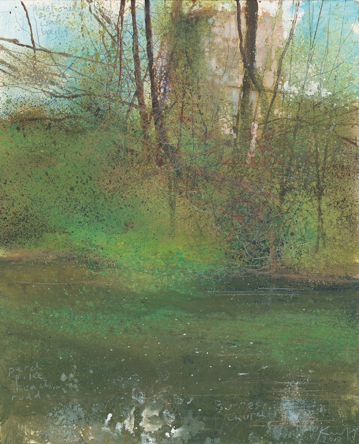Kurt Jackson (1961-): Bures church, perch, pike, roach, rudd (2018). Private collection