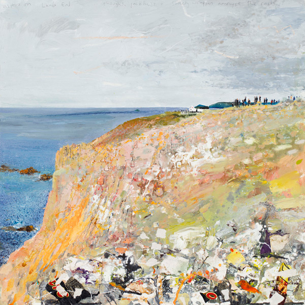 Kurt Jackson (1961-): Visitors on Lands End; choughs, jackdaws, sweet wrappers amongst the rocks (2015)