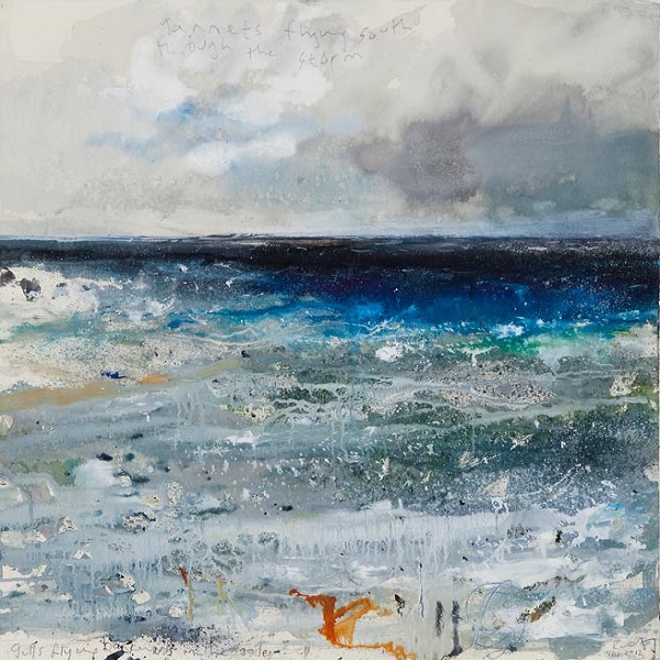 Kurt Jackson (1961-): Gannets flying south through the storm. Gulls flying backwards in the gales (2012). Private collection