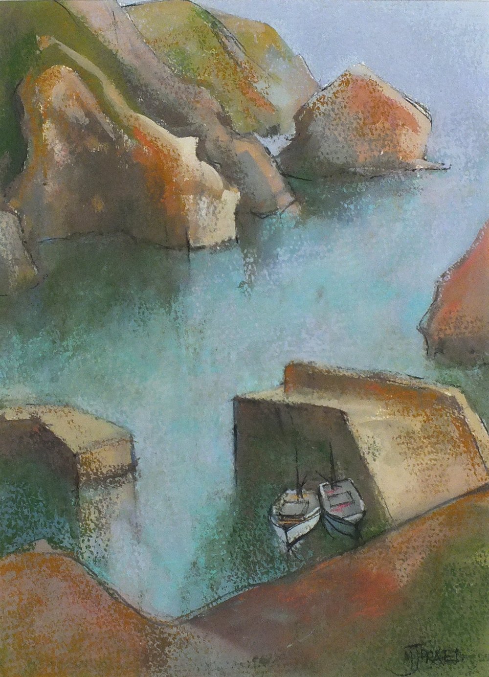 Michael Praed (1941-): Cliff Harbour (with Two Small Boats)