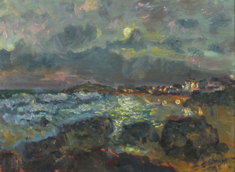 Michael Strang (1942-2021): Dusk: Porthmeor, St Ives with Distant Godrevy Lighthouse