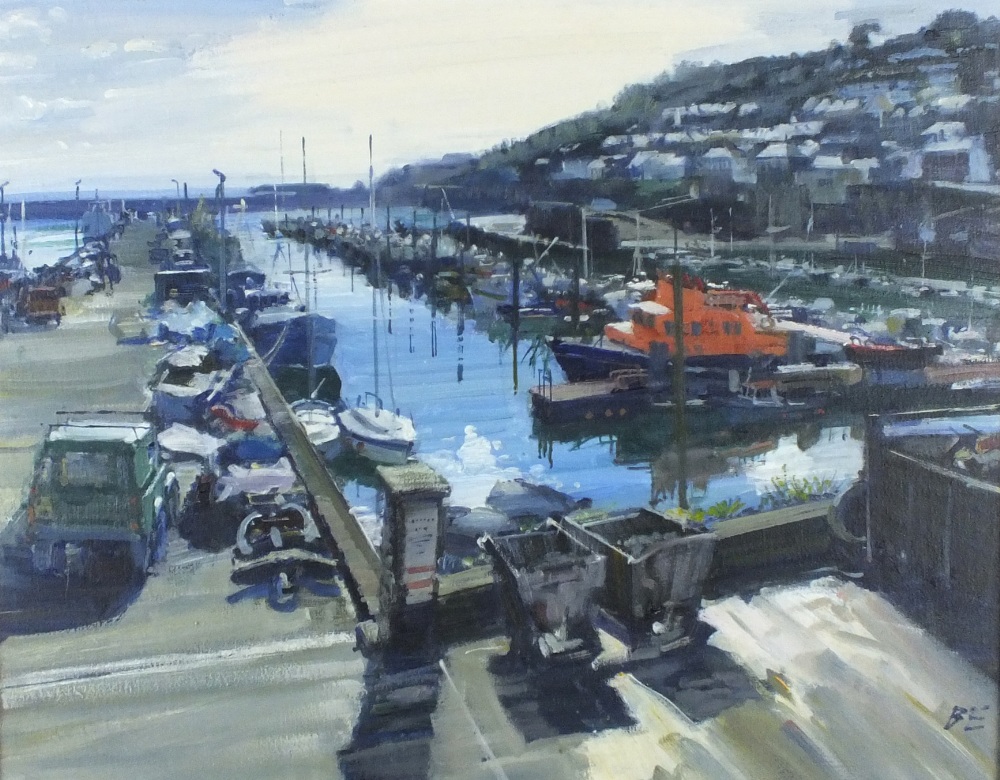 Bernard Evans (1929-): Newlyn Harbour, Penlee Lifeboat against the Light