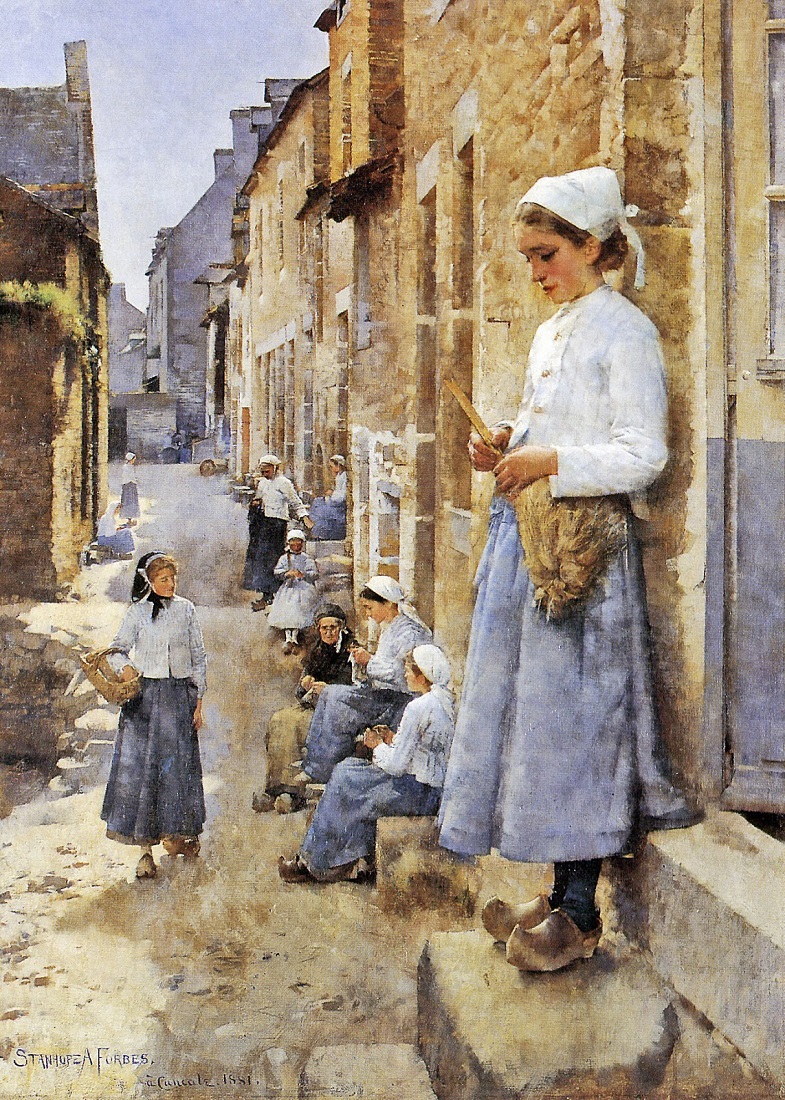 His principal model was a young girl from the village called Desiree. She had worked in the hotel in which he was staying but had been dismissed for stealing. Forbes wished to pay her only when the picture was completed. Desiree sensibly struck a deal and insisted on a daily payment. Forbes was forced to agree and seemed well satisfied with her work. He wrote to his mother "she grows more perfect every day and seems to be as charming as she looks". Desiree is holding an implement used for making or repairing nets, possibly making a string bag. The other women in the street are knitting. Forbes declared himself pleased with the picture but in a letter to his mother said "I fear from certain peculiarities it won't go down at all well with the British public".