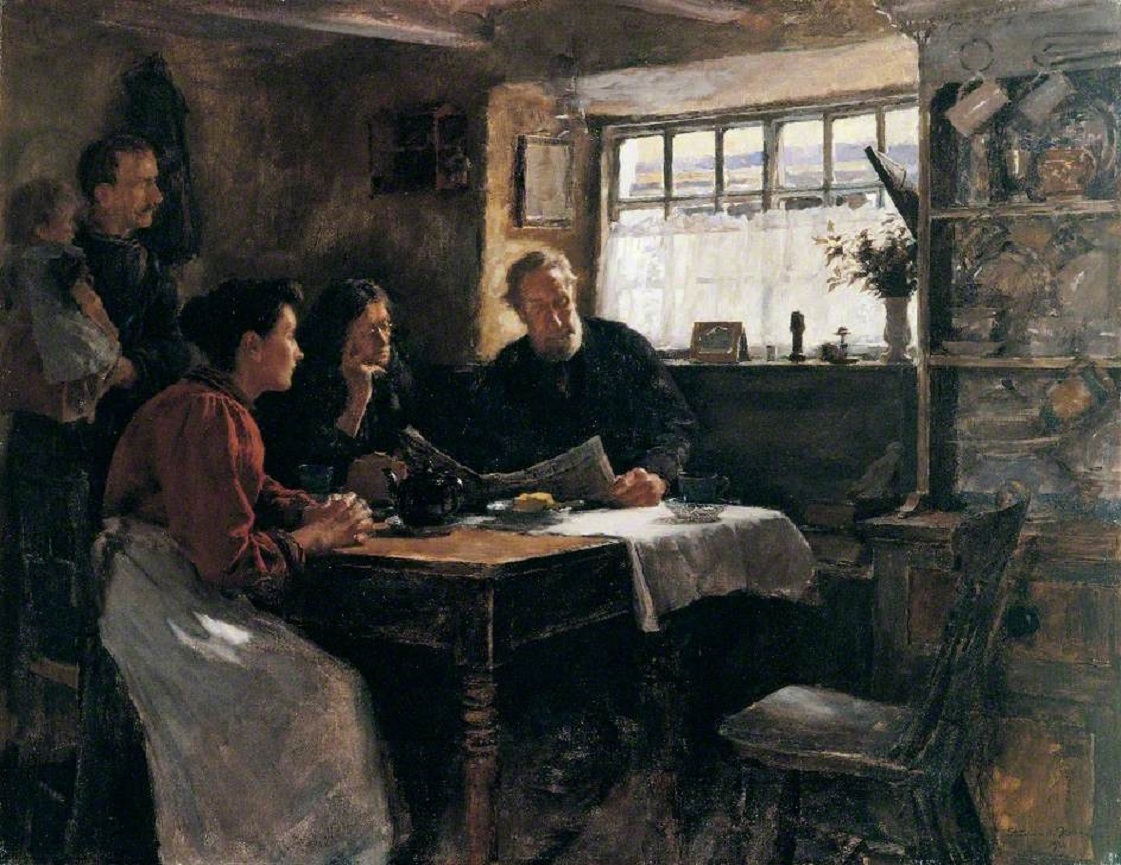 Despite his declared aim of working in the open air, Forbes also painted a number of interior scenes such as The Village Philharmonic, 1888 and By Order of the Court, 1890. Reading the News, although in some respects similar to these earlier works, was also a new departure. Whilst he was not in the least interested in painting ‘historic’ events, the death of Queen Victoria presented Forbes with a unique opportunity to combine portraiture, everyday life and history within a single composition. The location has been identified as Primrose Cottage, Newlyn, and the sitters as the Hichens family and two others. All were friends of the artist but appear completely engrossed as the momentous news is read out. Through an otherwise everyday breakfast scene, Forbes has evoked the affection in which the Queen was held, even in the remotest communities. The poignancy of the moment is enhanced by the gentle light falling from a single window upon the family and their simple homely possessions. Victoria had died on the 21st January, 1901 but in an age before television, radio and the internet many outside of the larger towns and cities would not have known until at least the following day. For these people, newspapers were the only source of national news other than word-of-mouth. Here Forbes commemorates the sense of loss experienced by a population who, for the most part, had known no other British sovereign.