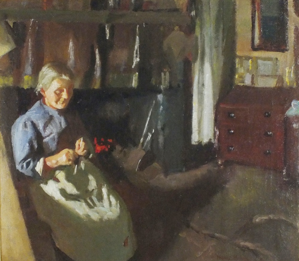 Harold Harvey (1874-1941): Knitting, Woman in a Kitchen (Undated)