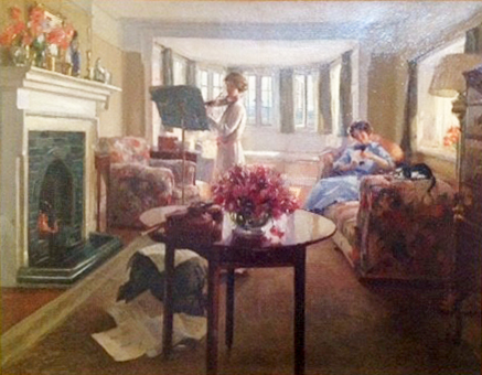 At Menwinnion. This Picture is the same as 'The Morning Room', except that a cat has "appeared" on the arm of the sofa. It could be that daughters Aileen and Nancy appealed to their father "....please Daddy could you put our cat into the picture" which Frank Heath did after it had been returned from the Royal Academy in 1914.