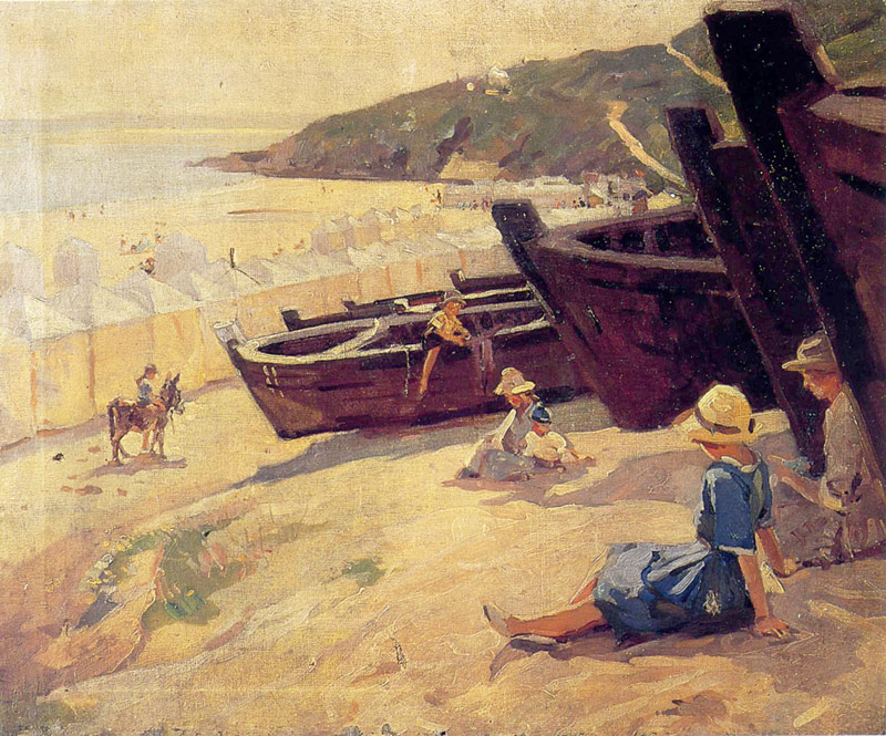 Very much a snapshot of a cornish holiday in the 1920s at Porthminster Beach near St. Ives. With the canvas beach huts, the pilchard boats and the smoke from the train (in the background) as it approached St Ives station. The painting shows Jessica, Aileen (in the blue dress), Tony (on the pilchard boat) and Gabriel (riding the donkey).