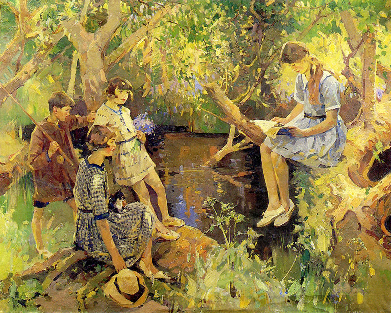 Painted by the pond at the bottom of the garden at Menwinnion, Aileen (with Silko, the cat), Nancy (reading) and the twins Tony and Gabriel. Laura Knight, when she was living at Lamorna (circa 1913), painted a very similar scene featuring "Lamorna" Birch and his children.