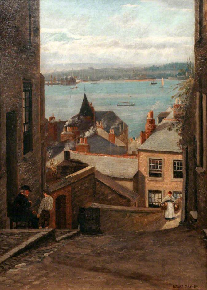 John Martin (1835-1908): Waterside, Saltash, from Silver Street (1900). Saltash Town Council