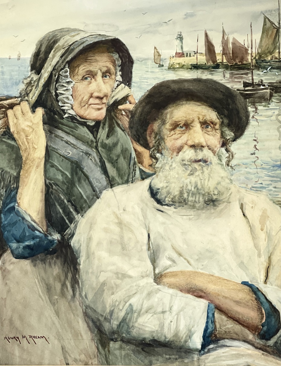 Henry Meynell Rheam (1859-1920): Billy and Blanche, Fish Jousters of Newlyn with the Busy Harbour Behind Them (Undated). Private collection