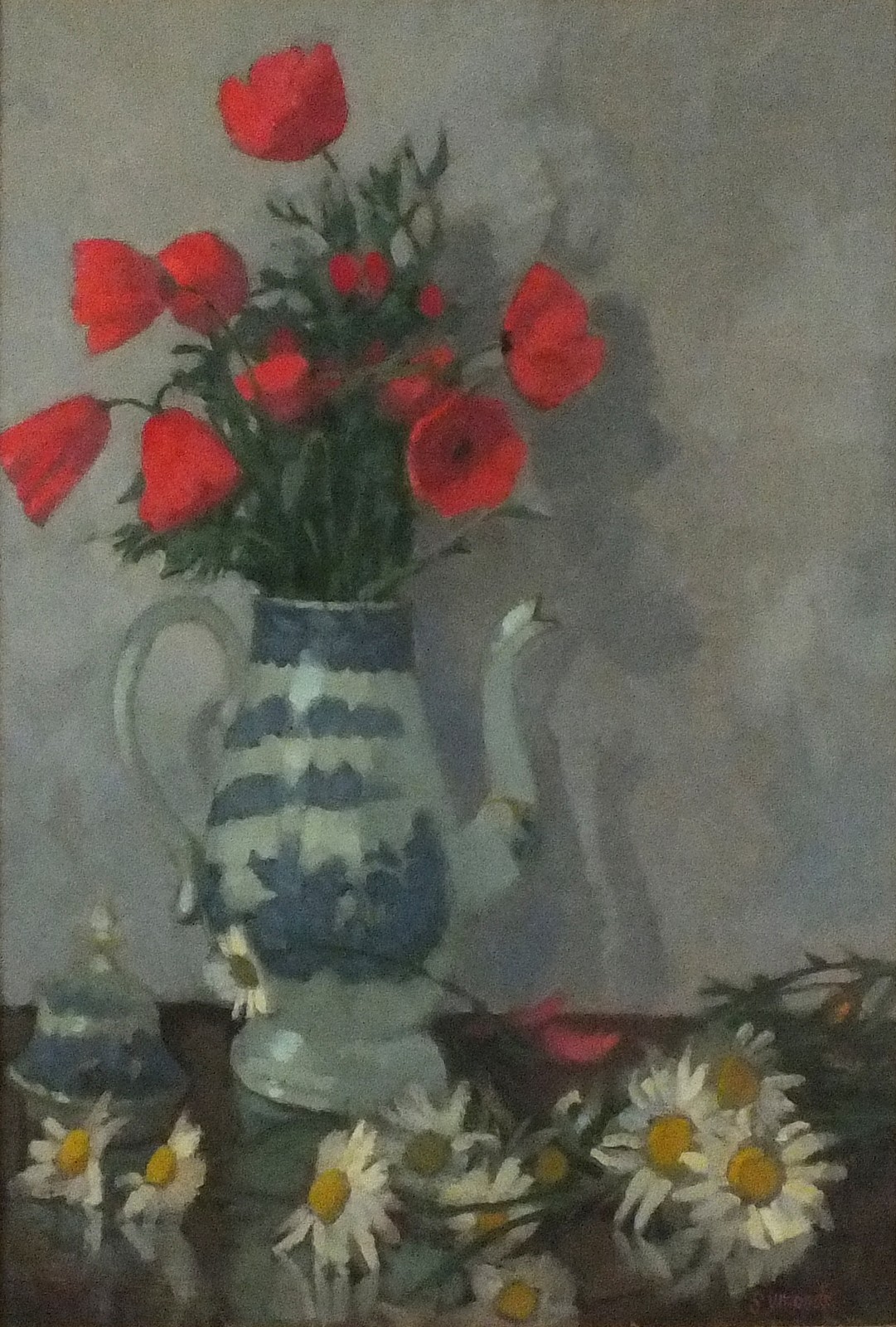 Ken Symonds (1927-2010): Poppies in a Blue & White coffee Jug (Undated)