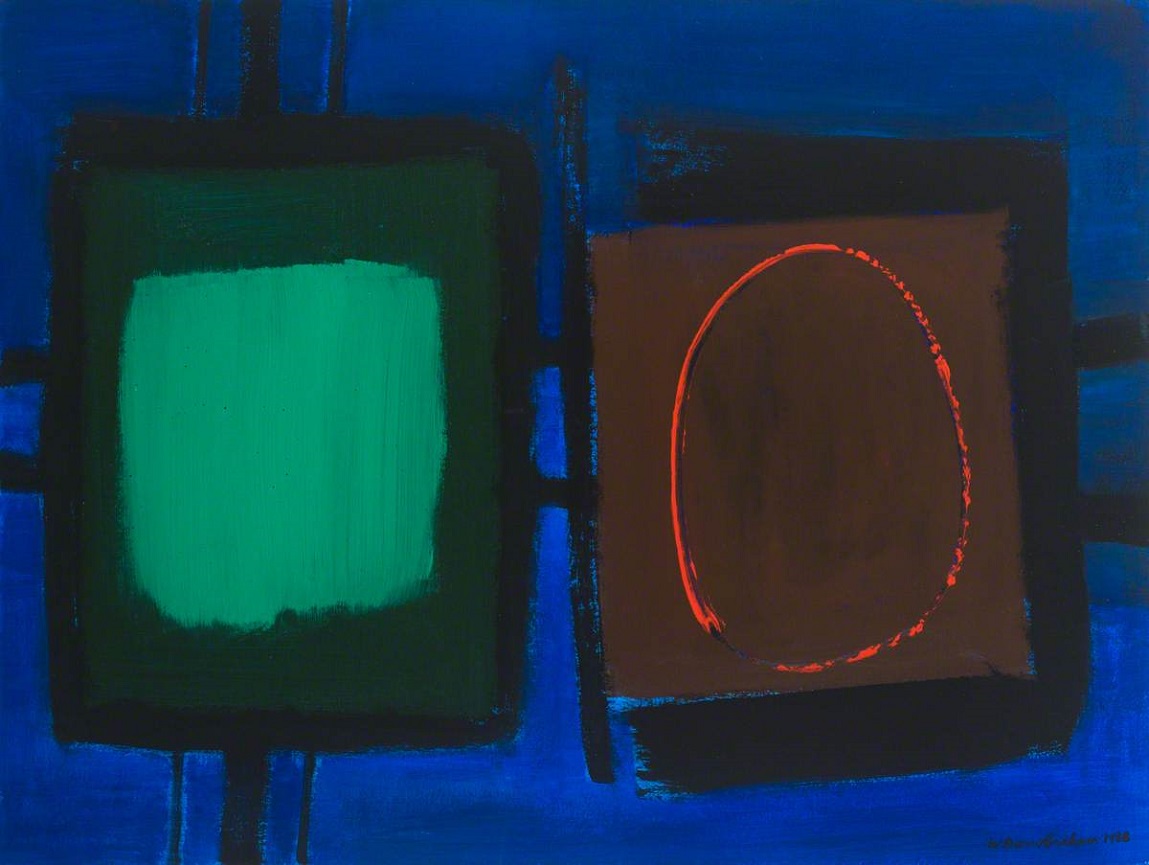 Wilhelmina Barns-Graham (1912-2004): Connected Forms No. 2 (On Blue, Emerald and Red Circle on Brown). Wilhelmina Barns-Graham Trust