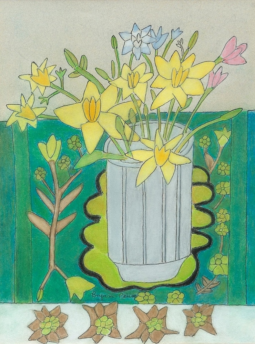 Bryan Pearce (1929-2007): Vase of Spring Flowers on a Patterned Tablecloth (Undated)