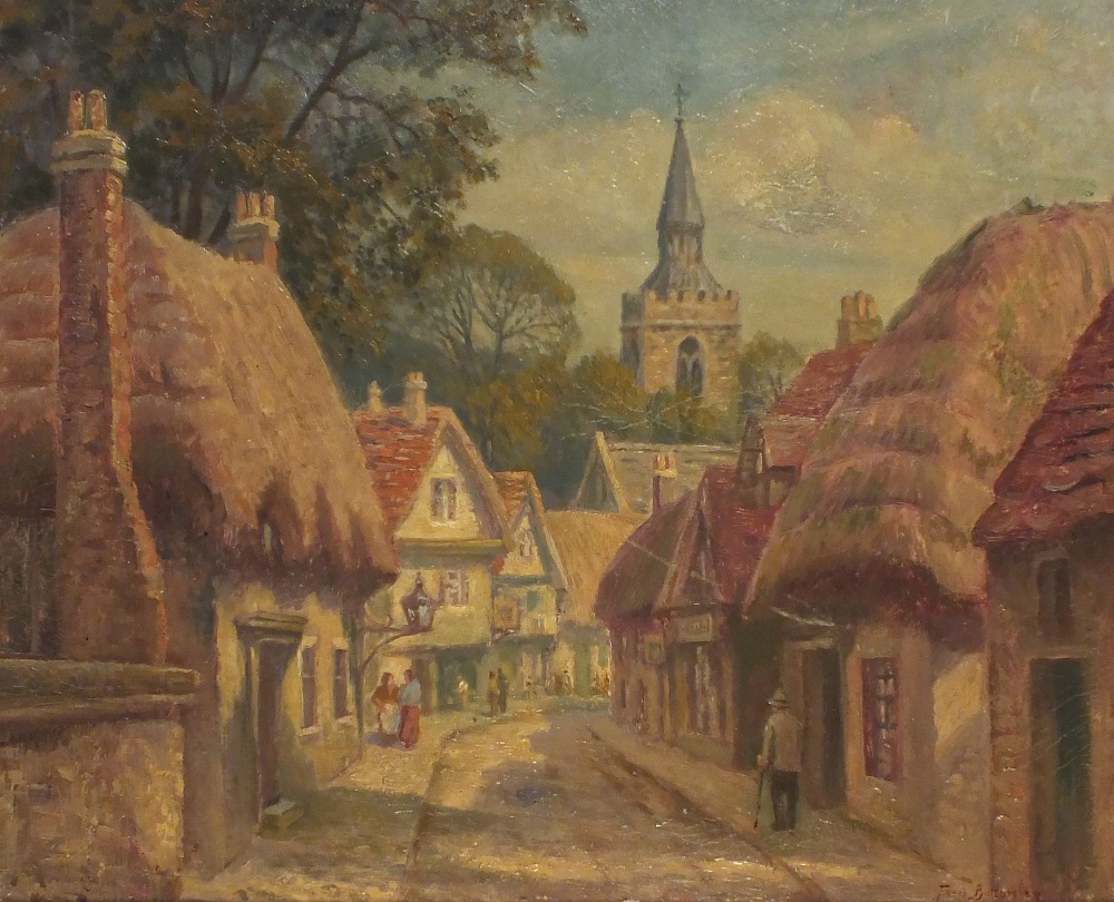 Frederic Bottomley (1883-1960): A Village Street Scene with Thatched Cottages and Church