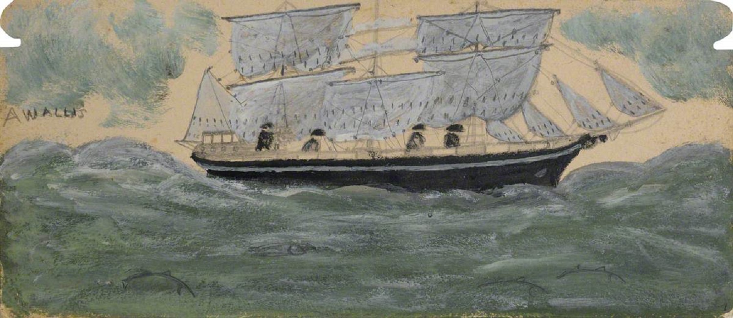 Alfred Wallis (1855-1942): Three-Master with Four Sailors and Four Dolphins in Green Sea (Date unknown). Kettle's Yard, Cambridge