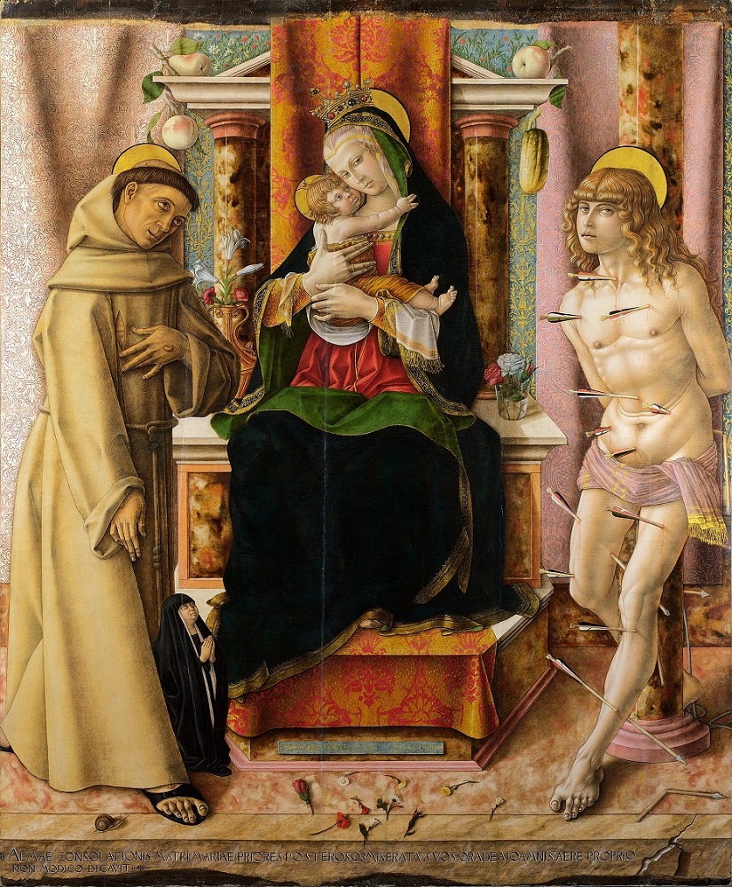 In a Crivelli painting you expect eye-catching detail; fruit, flower, birds. Their function is to symbolise a facet of the sacred mystery shown. However, in this painting there is one detail which is anything but symbolic. The little woman praying by the feet of St Francis looks like a nun but, in fact, she is a widow wearing a customary black veil. Her late husband’s will had asked that she found a chapel where Mass could be offered for the repose of his soul. She is positioned in the customary place of the patron. but her late husband’s absence is striking, once noticed. Moreover, the inscription at the base of the throne tells the viewer that she paid for this work “at no small expense and of her own money”. Her name was Oradea Becchetti. The two saints who flank the Virgin’s throne must have been of her choosing. The choice of St Francis was an obvious one: it was a Franciscan Church. St Sebastian can only have been included for one reason: his cult as a plague saint. The Madonna and Child to whom she prays are closely styled on a type of Byzantine icon known as Eleusa or the Virgin of Tenderness. This church was located in the Marches which had been ravaged by plague in the last decades of the 15th Century. There was an established tradition of invoking the protection of Our Lady of Tenderness from the plague and so by referencing the ancient icon in the embrace of the Virgin and Child Crivelli asks for her intercession also. As in so many of his altar pieces, Our Lady is shown enthroned, as the Mother of God and Queen of Heaven, flanked by saints and symbols, but in this one, the embrace of Mary and Jesus sled on the ancient icon tells the viewer that although Oradea Becchetti may have prayed for the soul of her dead husband, for greatest concern was for the living and their protection from the plague.