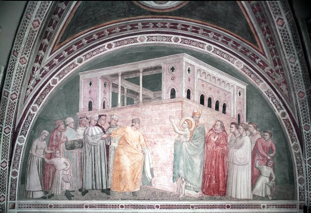 Giotto di Bondone (1266?-1337): St Francis Renounces Worldly Goods (c.1320). Bardi Chapel, Basilica di Santa Croce, Florence