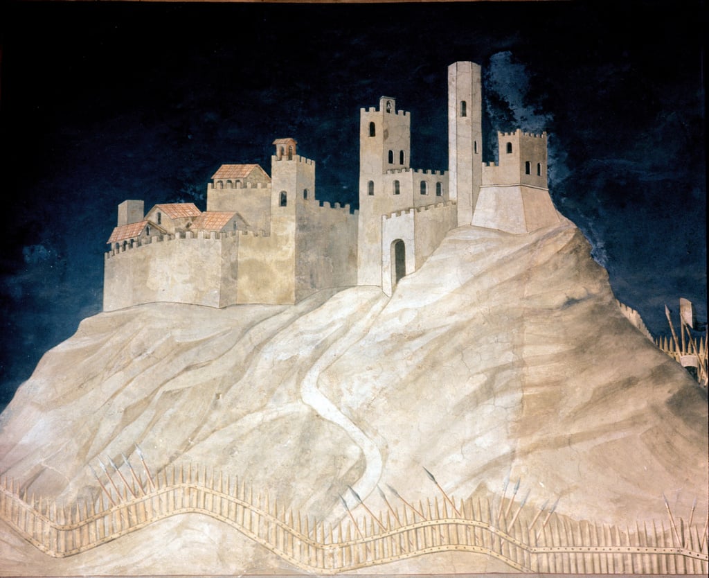 Simone Martini (1284-1344): View of the Castle of Montemassi in Maremma (c.1328). Pazzo Publico, Siena