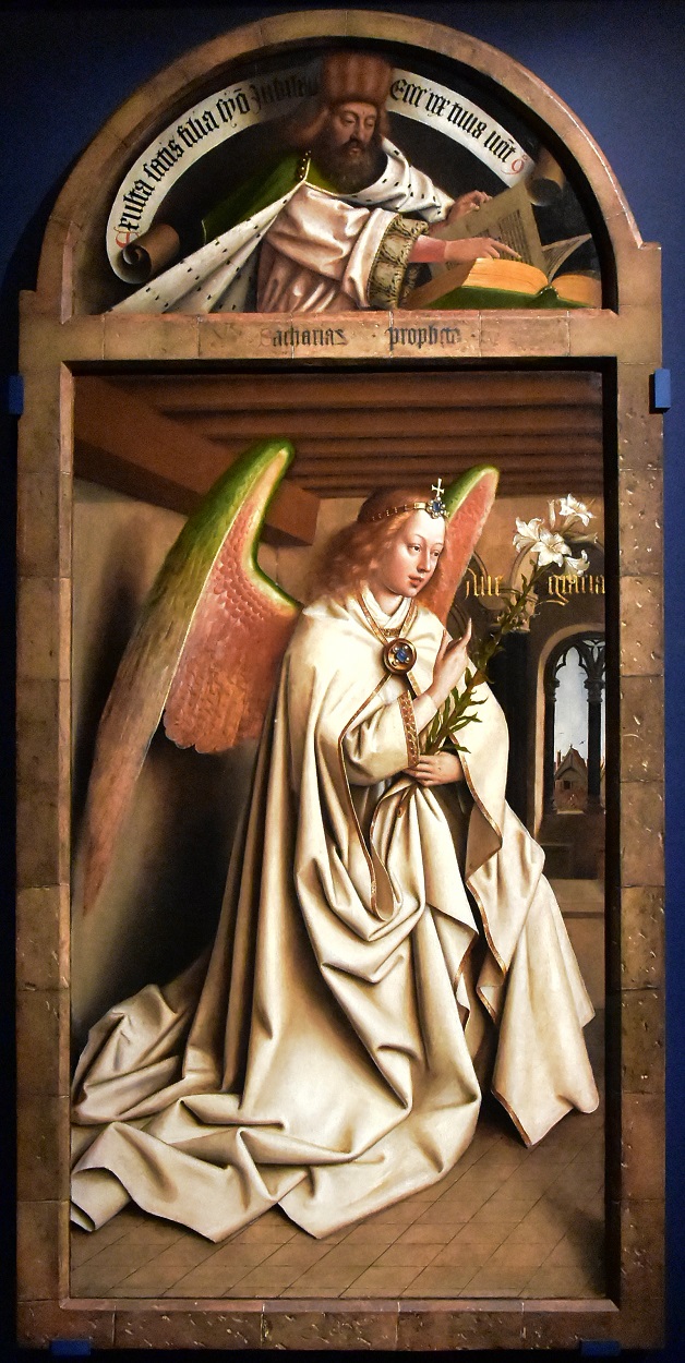 Jan van Eyck (c.1390-1441): The Annunciation: Archangel Gabriel and the Prophet Zacharias (Ghent Altarpiece (1420-32). St Bavo's Cathedral, Ghent