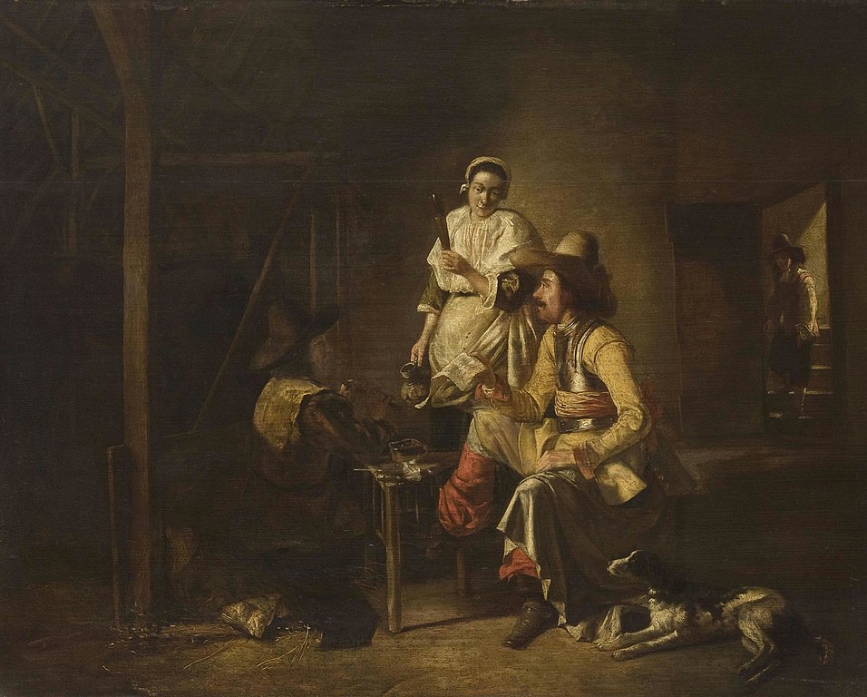 Pieter de Hooch (1629-1684): Soldiers with a Serving Maid in a Barn (1650s). Philadephia Museum of Art