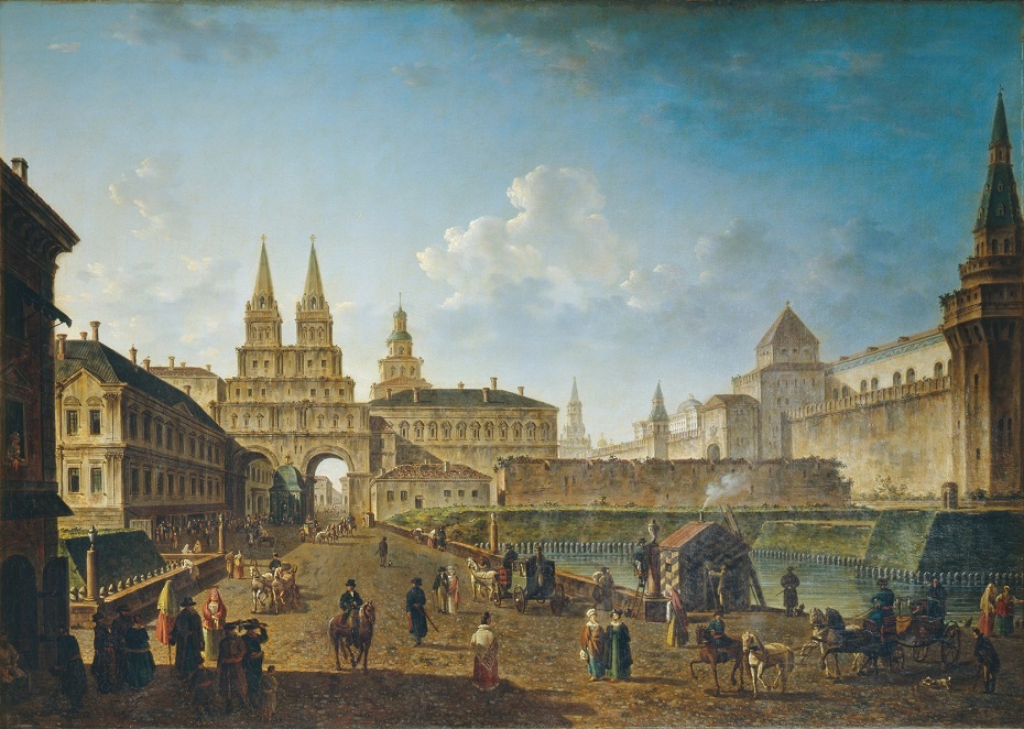 The majestic monuments of medieval architecture in Moscow are the main ‘heroes’ of this painting by Alexeev. In the foreground, the artist shows the bridge across the Neglinka River leading to the Resurrection (Iversky) gates with their twin towers, and the Iversky chapel standing between the twin arches. The building of the Great Pharmacy where the university was initially housed stands in front of the gates to the left. To the right of the painting we can see the Arsenal Tower of the Moscow Kremlin and part of the Kitai-Gorod wall between the Iberian Gate and the Arsenal Tower. The Mint building lies to the left of the painting. The entire scene is bathed in sunlight giving it warm, golden tones. When looking carefully at the numerous figures crowding the square, one gets a real idea of what Moscow streets must have looked like at the turn of the I8th to I9th centuries. The carriages, wagons, riders on horseback and dogs, are all clearly important to the artist in giving accurate impression of the ancient capital city.