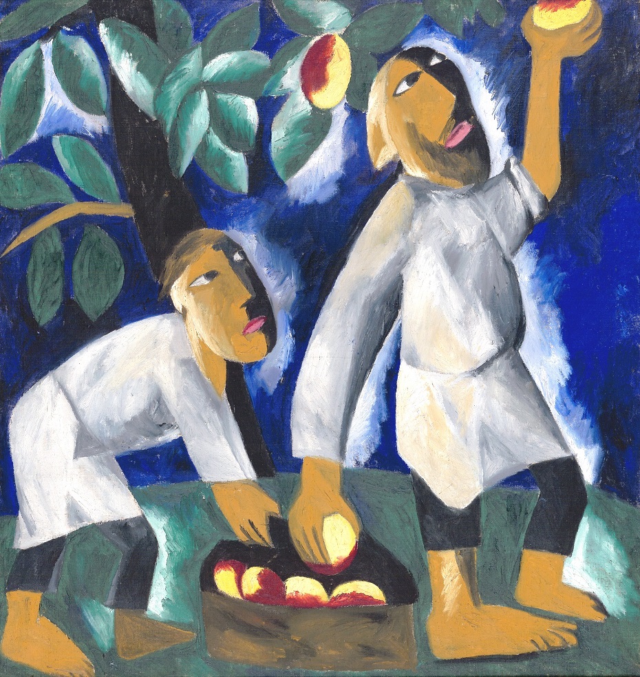 At the turn of the 1910s, the “idol mask” in Goncharova’s paintings becomes ever more prominent. That mask appeared as a synthesis of her impressions from contemplating Scythian stone women and getting acquainted with African sculpture. It gave a special scope to the artist “theatrical” inclinations. It seems that in the painting Peasants Picking Apples, peasants are not peasants anymore but kind of wooden idols so strong is the wildness in these stump-like figures, slumped back faces, pupils and whites of their slanting eyes. The movement of the painter’s brush seems to reproduce the movements of the characters themselves. It repeats their crude gestures, the plasticity of motion is simplified, the heads are stretched a little, and the hands reaching for fruit become even longer. The sullen appearance of the characters seemed to be transferred to the artist herself. It seems that her hand holding a brush has lost its former lightness and moves with difficulty and strain.