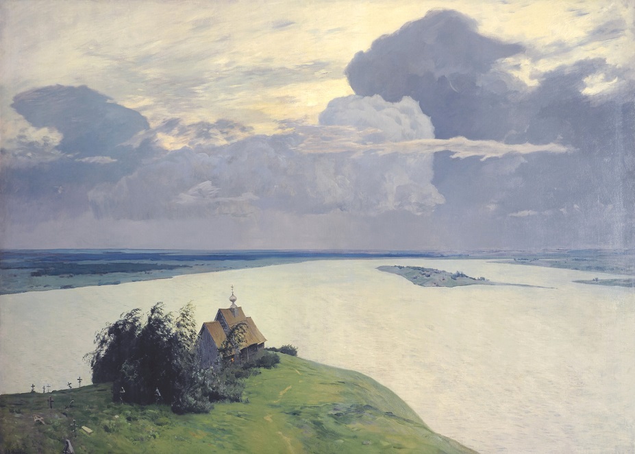 The image of Russian nature, with its lack of bright colours and contrasts, is endowed in this landscape with heroic features. The artist is contemplating the world as if from a bird's eye view. A nature panorama is unfolding majestically before his eyes. The theme of the mysterious incomprehensibility of the world has in this landscape a solemn and stern ring to it. The space opened sideways and upwards is presented as generalised planes: those of the water and the sky, painted using same colour values, which boosts the picture's monumental character. A certain struggle, collision, seems to be surging in the lofty sky open sideways and upwards. The celestial drama is not reflected in the steel scales of the water. The sky and the land – parts of the faceless cosmos – are made alien to each other. It is only the protruding cliff with a wooden church on top that testifies to the presence of the human soul, fragile but full of faith. The confrontation between the human spirit and the infinity of the universe acquires in this painting an epic, cosmic scale.